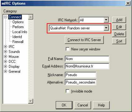 3. Et normalement, une belle boite de dialogue apparait ! (voir l'image ci-dessous). Commencez par remplir les champs 'Full name' c'est à dire votre nom (Mettez votre Pseudo si vous voulez); 'Email' avec votre email :), 'Nickname' par votre Pseudo, et 'Alternative' par un Pseudo de rechange (si votre Pseudo principal est déjà utilisé par une autre personne). Ensuite clickez sur le menu déroulant en haut (celui encadré en rouge sur l'image ci-dessous) et selectionnez 'QuakeNet: Random Server' Et clicker sur le bouton 'OK' tout en bas une fois tout ceci fait ;).