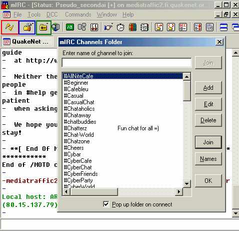 4. Maintenant regardez l'image ci-dessous, et clickez sur l'icone encadré en rouge sur l'image : Cela va vous connecter au serveur ! (A titre d'information l'icone bleue sers à afficher les options, et la verte la popup qui est apparue en vous connectant). Et justement, une popup est apparue, avec plein de nom de chan (canaux) mais ils sont tous anglophones donc vous pouvez les Supprimer (avec le bouton Delete ou CTRL+D).