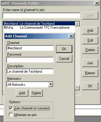 5. Nouvelle image en dessous, j'ai supprimé tout les canaux et ajouté deux canaux avec le bouton 'Add' et de nouveau clické sur 'Add' pour vous montrez comment remplir cette fenetre: Le champ 'Channel' par le nom du Canal (ici #techland), le champ 'Password' par le mot de passe du canal (ici il n'y en a pas), Le champs 'Description' par une decription (facultatif) et pour finir la case 'Join channel on connect' fera que la prochaine fois que vous vous connecterez au serveur irc, vous joindrez immédiatement ce canal.